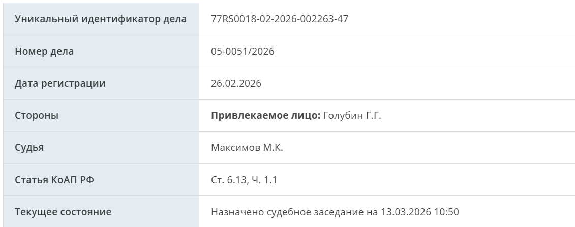 Дело было зарегистрировано 26 февраля. Разбирательство состоится 13 марта в Никулинском районном суде Москвы. Конкретный трек исполнителя, который стал причиной для привлечения к ответственности, не уточняется.