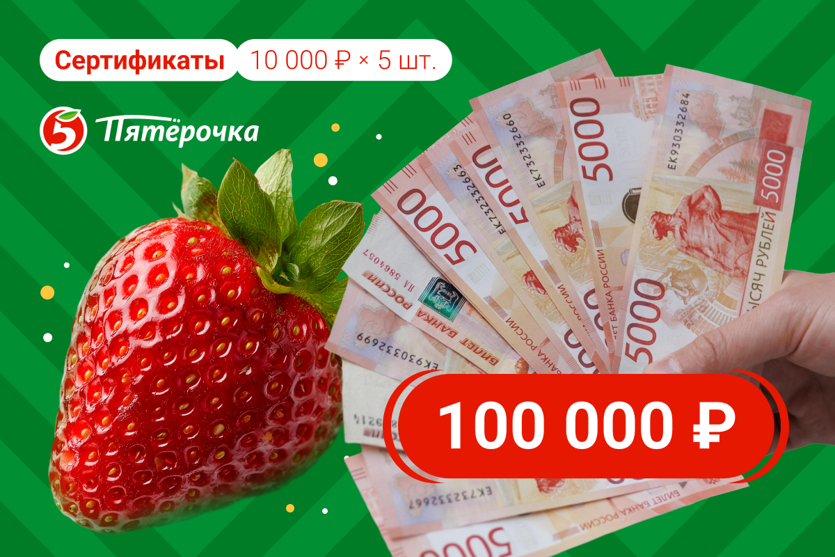 В текущем конкурсе разыгрываются 100 000 рублей и подарочные карты в сеть магазинов «Пятерочка».