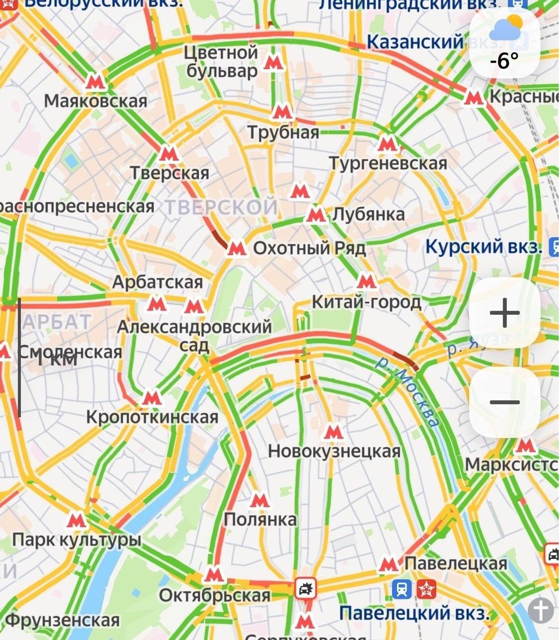 Согласно данным «Яндекс Карт», текущий уровень загруженности дорог в столице оценивается в 4 балла. Уже сейчас движение осложнено на Кремлевской и Москворецкой набережных, а также на Тверской и Валовой улицах.
